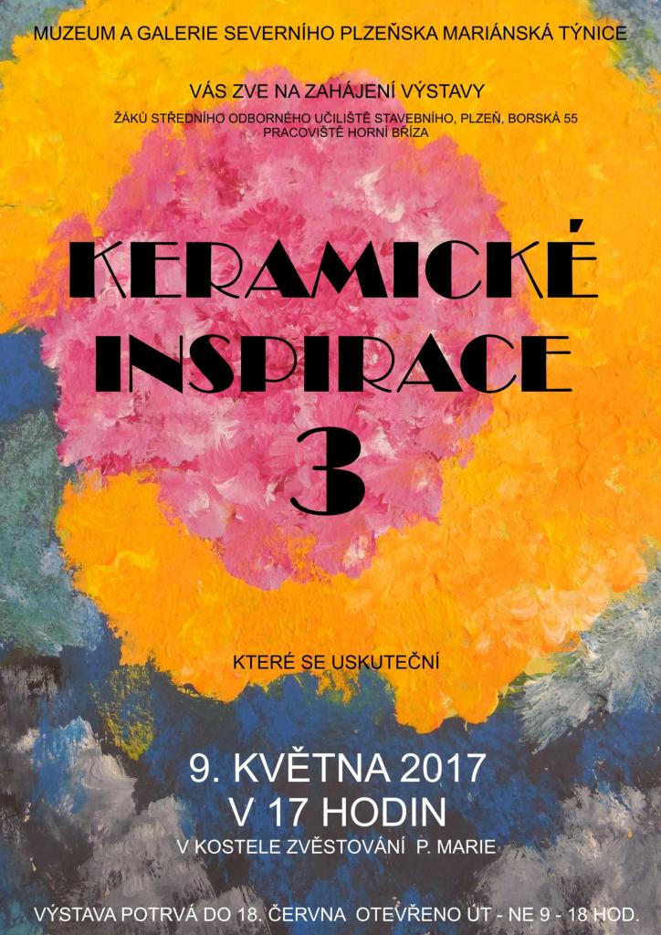 Muzeum a galerie severního Plzeňska v Mariánské Týnici si Vás dovoluje pozvat na zahájení výstavy žáků Středního odborného učiliště stavebního v Horní Bříze pod názvem - KERAMICKÉ INSPIRACE 3. Výstava bude zahájena 9. května 2017 od 17.00 hodin v kostele Zvěstování P.Marie v Mariánské Týnici a potrvá do 18.června 2017.
