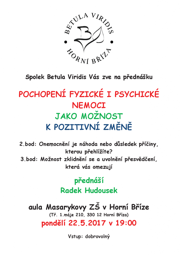 Spolek Betula Viridis Vás zve na přednášku "POCHOPENÍ FYZICKÉ I PSYCHICKÉ NEMOCI JAKO MOŽNOST K POZITIVNÍ ZMĚNĚ" přednáší pan Radek Hudousek v divadle/aula Masarykovy ZŠ v Horní Bříze v pondělí 22.5.2017 od 19:00. Vstup je dobrovolný.